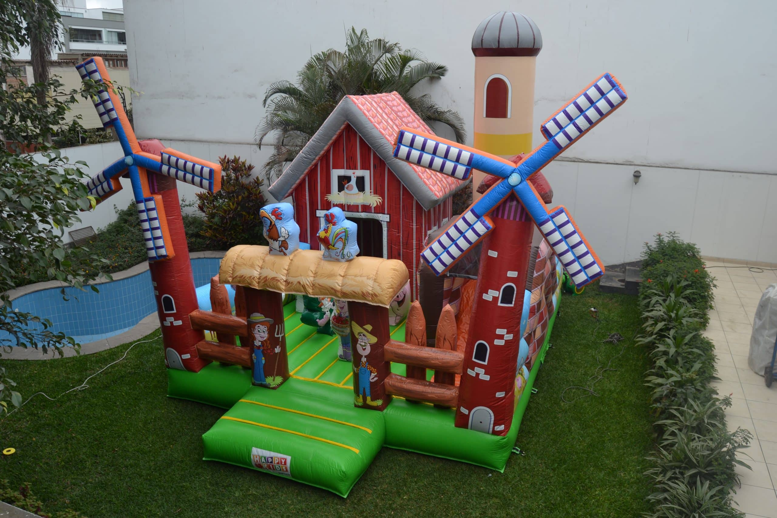 Este encantador inflable temático recrea una granja llena de colores, animales y molinos, ideal para que los niños vivan una experiencia campestre mientras saltan, corren y se divierten en un entorno seguro y alegre.